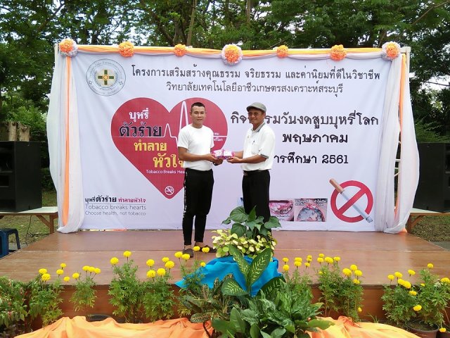 มอบรางวัลให้กับนักเรียนที่ชนะการแข่งขันแต่ละกิจกรรม ทำให้ทุกคนมีความสุขสนุกสนานกับการร่วมกิจกรรมต่างๆ คำขวัญวันงดสูบบุหรี่โลก