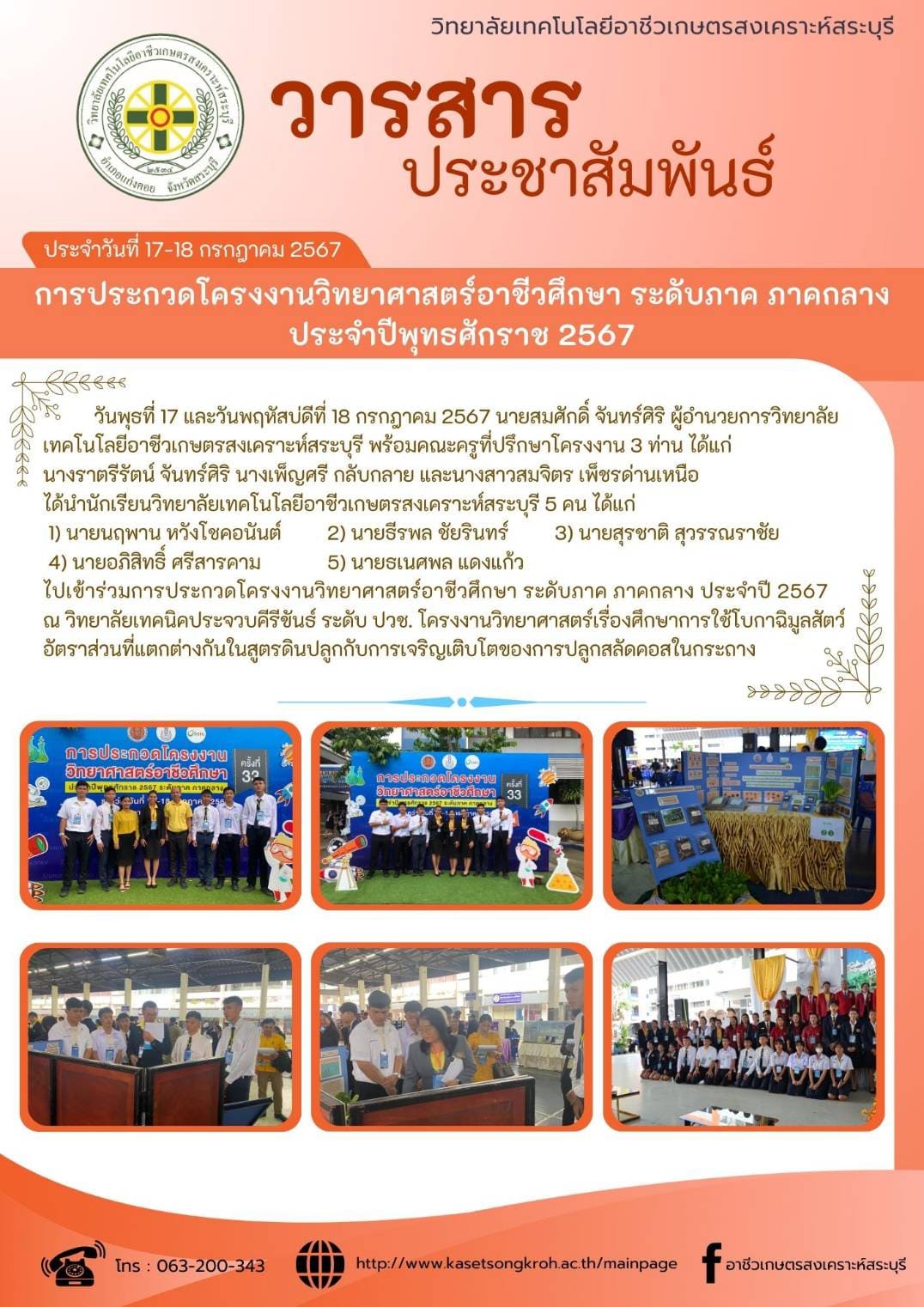 การประกวดโครงงานวิทยาศาสตร์อาชีวศึกษาระดับภาค ภาคกลาง ประจำปีการศึกษา 2567 วันพุธที่ 17 และวันพฤหัสบดี 18 กรกฎาคม พ.ศ. 2567 นายสมศักดิ์ จันทร์ศิริ ผู้อำนวยการวิทยาลัยเทคโนโลยีอาชีวเกษตรสงเคราะห์สระบุรี พร้อมคณะครูที่ปรึกษาโครงงาน 3 ท่านได้แก่ 1. นางราตรีรัตน์ จันทร์ศิริ 2. นางเพ็ญศรี กลับกลาย 3. นางสาวสมจิตร เพ็ชรด่านเหนือ ได้นำนักเรียนวิทยาลัยเทคโนโลยีอาชีวเกษตรสงเคราะห์สระบุรี 5 คน ได้แก่ 1. นายนฤพาน หวังโชคอนันต์ 2. นายธีรพล ชัยรินทร์ 3. นายสุรชาติ สุวรรณราชัย 4. นายอภิสิทธิ์ ศรีสารคาม 5. นายธเนศพล แดงแก้ว ได้เข้าร่วมการประกวดโครงงานวิทยาศาสตร์อาชีวศึกษาระดับภาค ภาคกลาง ประจำปีการศึกษา 2567 ณ วิทยาลัยเทคนิคประจวบศิริขันธ์ ระดับ ปวช. โครงงานวิทยาสาสตร์เรื่อง ศึกษาการใช้โบกาฉิมูลสัตว์อัตราส่วนที่แตกต่างกันในสูตรดินปลูกกับการเจริญเติบโตของการปลูกสลัดคอสในกระถาง |
