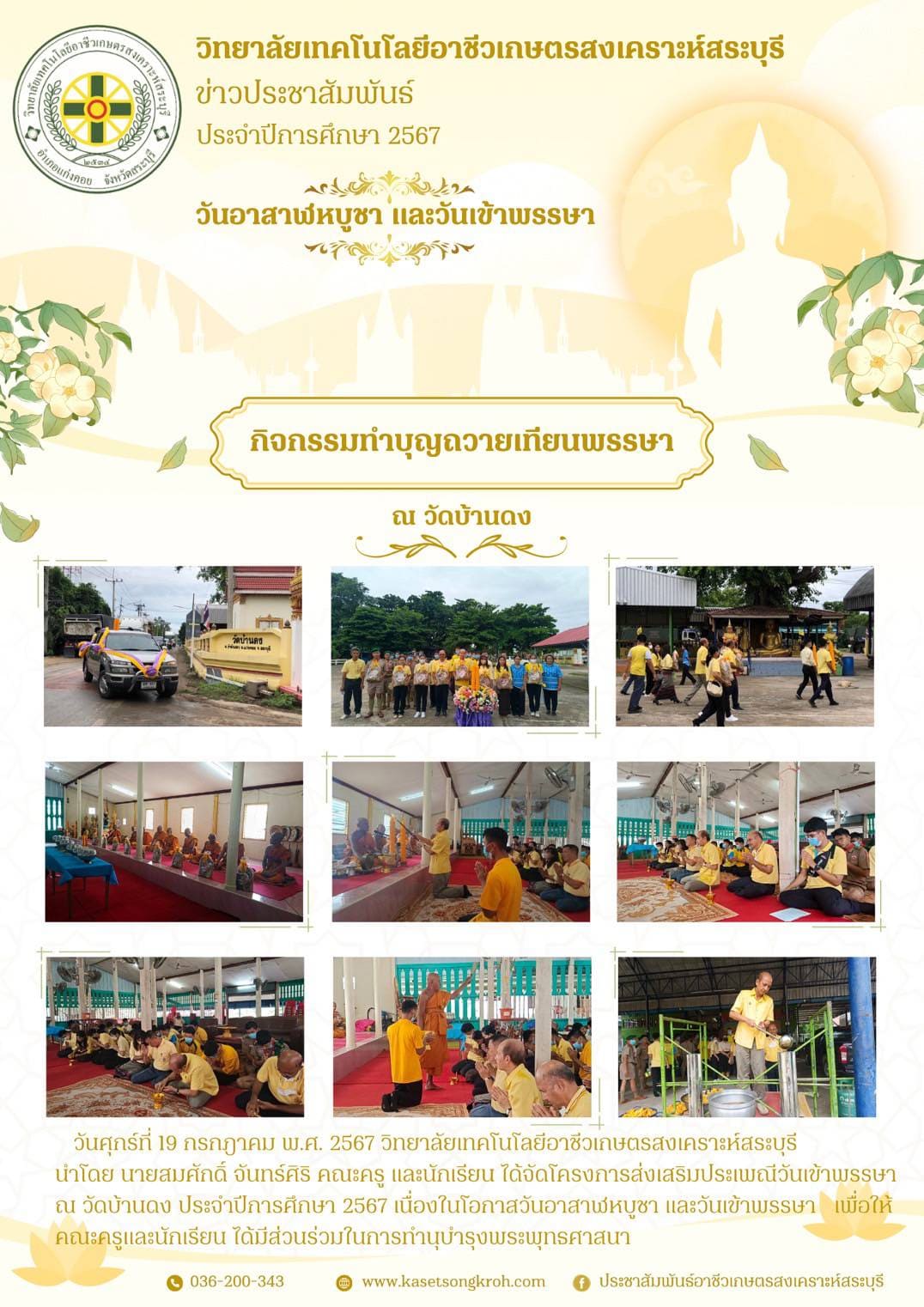 วันศุกร์ที่ 19 กรกฎาคม พ.ศ. 2567 วิทยาลัยเทคโนโลยีอาชีวเกษตรสงเคราะห์สระบุรี นำโดย นายสมศักดิ์ จันทร์ศิริ คณะครู และนักเรียน ได้จัดโครงการส่งเสริมประเพณีวันเข้าพรรษา ณ วัดบ้านดง ประจำปีการศึกษา 2567 เนื้องจากในโอกาสวันอาสาฬหบูชา และเข้าพรรษา เพื่อให้คณะครูและนักเรียน ได้มีส่วนร่วมในการทำนุบำรุงพระพุทธศาสนา |